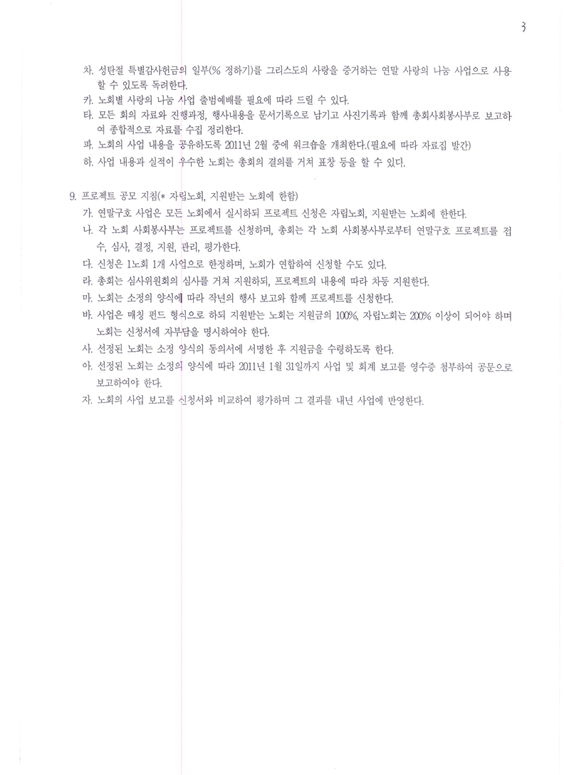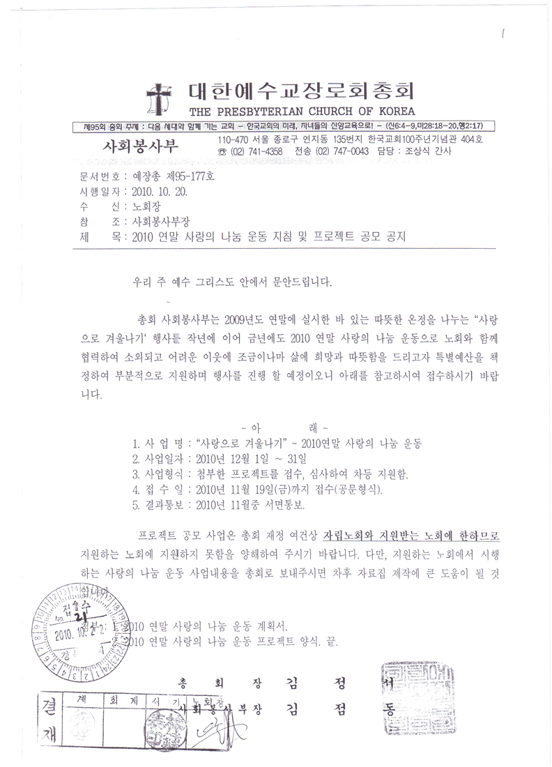 첨부 1. 총회사회봉사부 공문“2010연말 사랑의 나눔 운동 지침 및 프로젝트 공모 모집”사본 1부