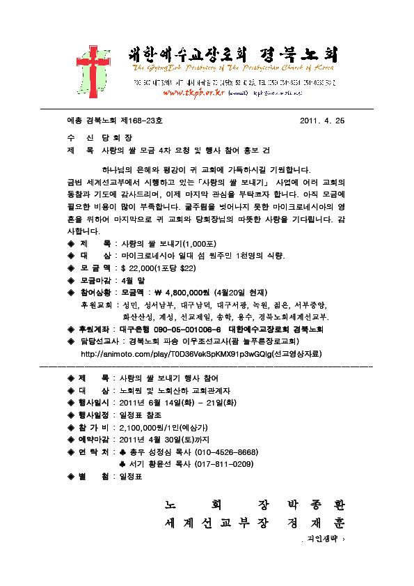 경북노회 <2011 청년연합예배> 참석협조 건