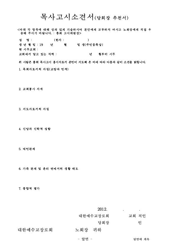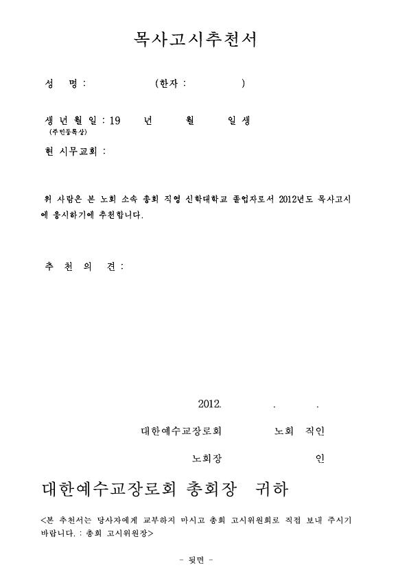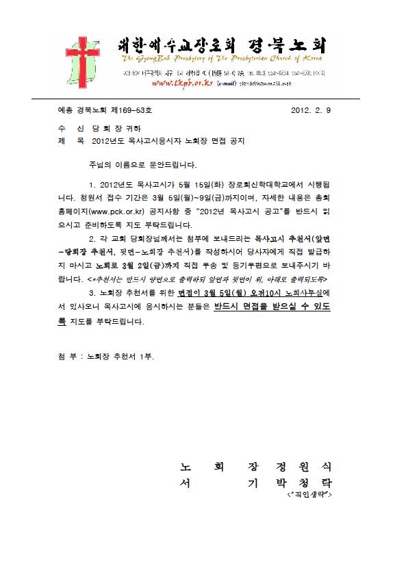 2012년도 목사고시응시자 노회장 면접 공지