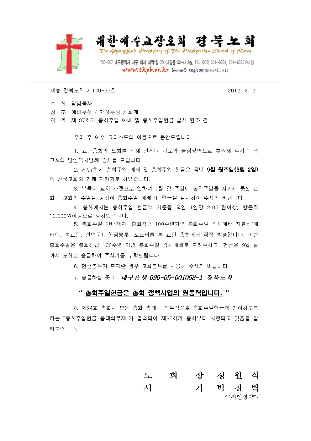 제97회기 총회주일 예배 및 총회주일헌금 실시 협조 건