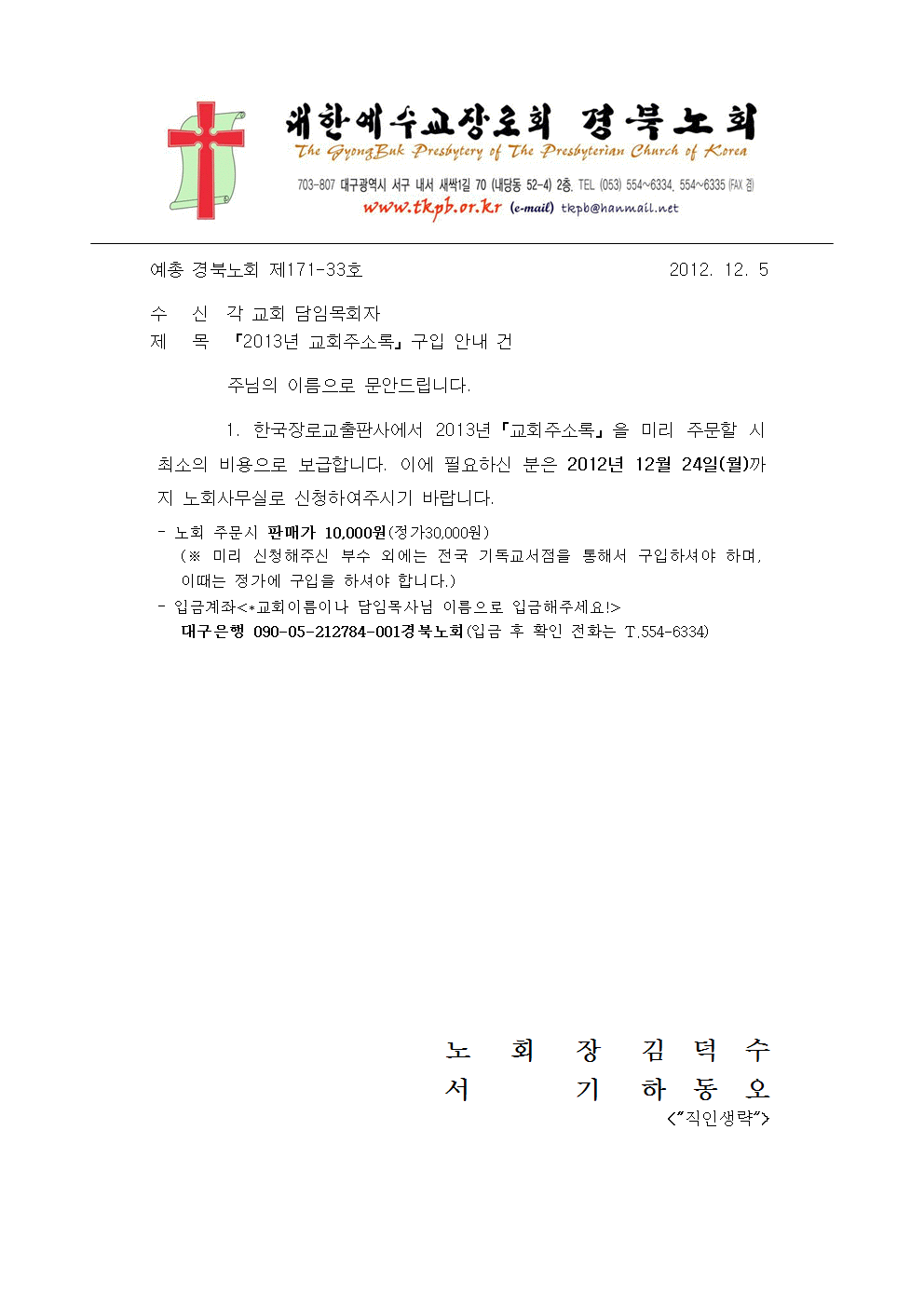 『2013년 교회주소록』구입 안내 건