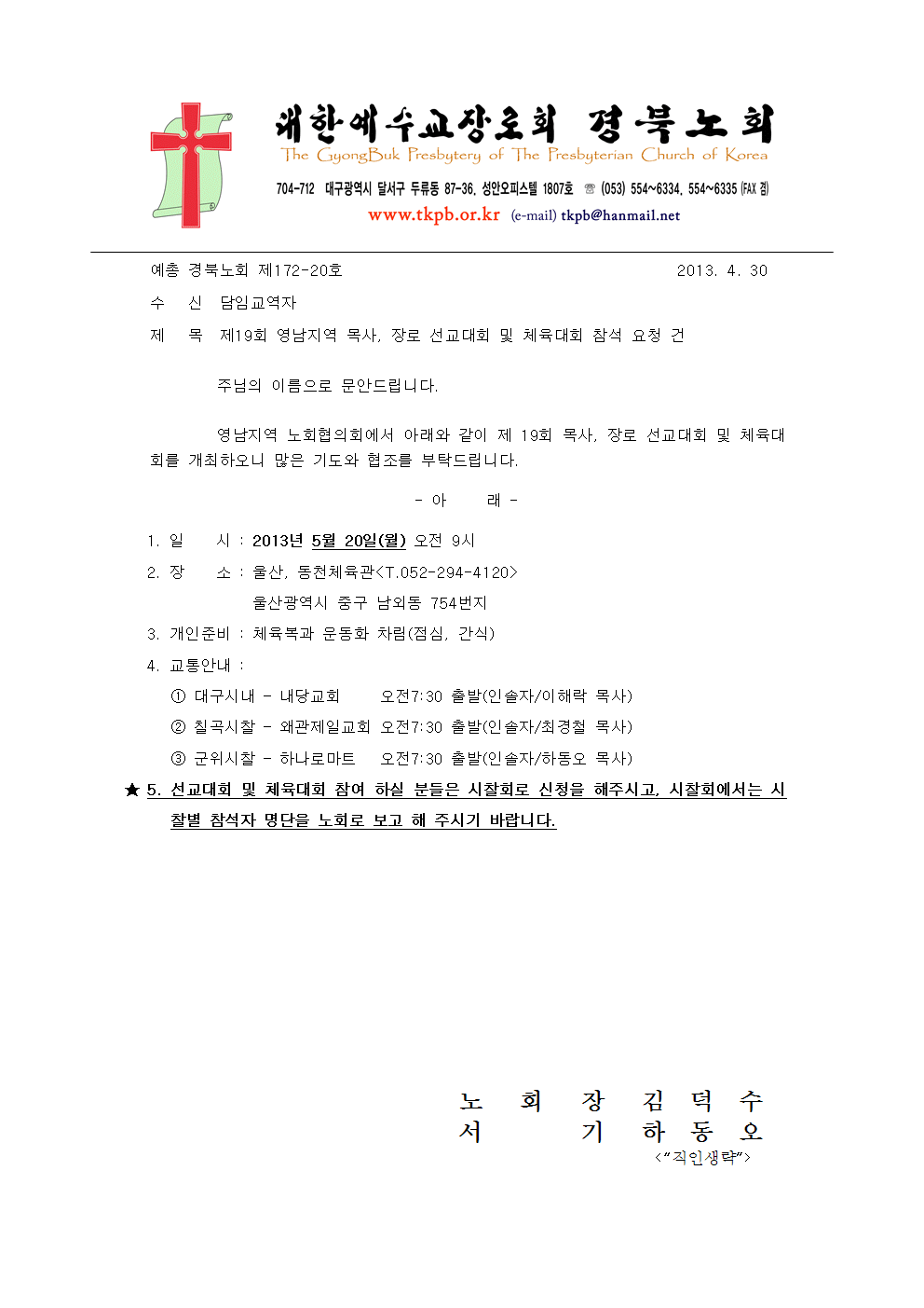 제19회 영남지역 목사 장로 선교대회 및 체육대회 참석 요청 건