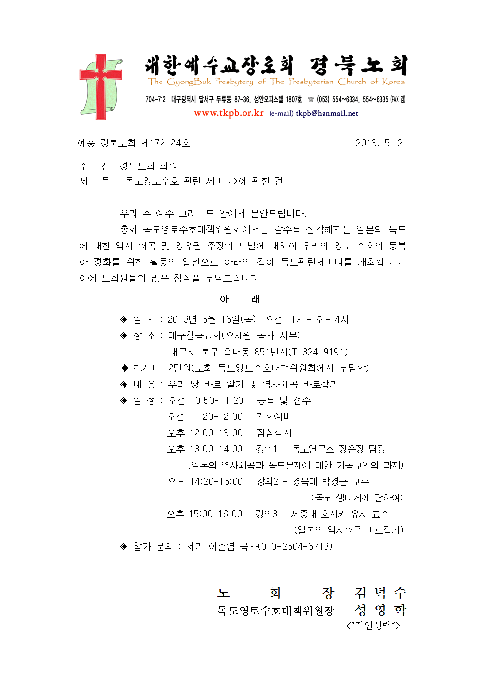 제19회 영남지역 목사 장로 선교대회 및 체육대회 참석 요청 건
