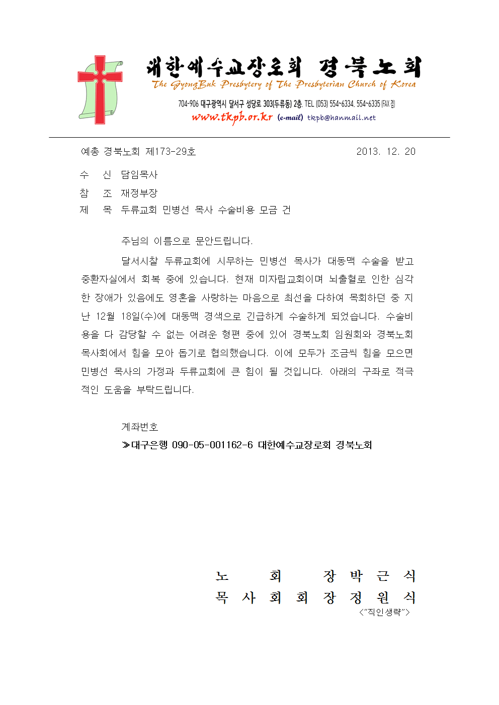 두류교회 민병선 목사 수술비용 모금 건