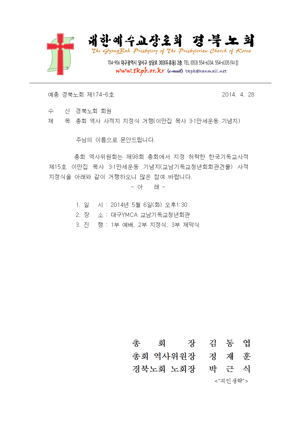 총회 역사 사적지 지정식 거행(이만집 목사 3․1만세운동 기념지)